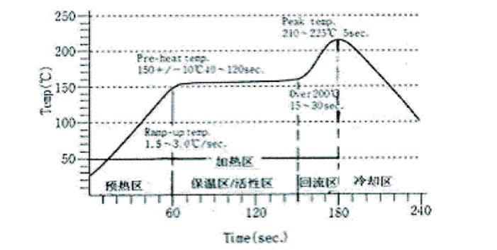 圖 1 是中溫錫膏( Sn63 / Sn62 )理想的紅外回流溫度曲線,它反映了 SMA 通過回流爐時, PCB 上某一點的溫度隨時間變化的曲線,它能直觀反映出該點在整個焊接過程中的溫度變化,為獲得最佳焊接效果提供了科學的依據,從事 SMT焊接的工程技術人員,應對理想的溫度曲線有一個基本的認識,該曲線由四個區間組成,即預熱區、保溫區/活性區、回流區、冷卻區,前三個階段為加熱區,最后一階段為冷卻區,大部分焊錫膏都能用這四個溫區成功實現回流焊。故紅外回流爐均設有 4 - 5 個溫度,以適應焊接的需要。